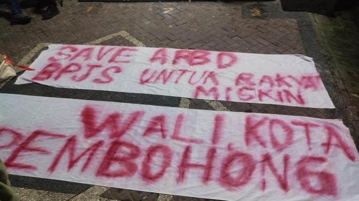 Spanduk berbahan kain putih polos tersebut bertuliskan “Wali Kota Pembohong” yang ditulis dengan cat semprot (pilok). Sebelum meninggalkan lokasi, massa melempari area kantor dengan batu. Aksi ini berlangsung sekitar 15 menit.