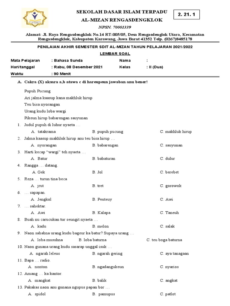Berikut ini adalah kumpulan soal ulangan Bahasa Sunda kelas 8 SMP/MTs yang mencakup berbagai topik seperti penggunaan kecap, struktur tata bahasa, dan nilai-nilai budaya. Soal-soal ini disertai dengan kunci jawaban untuk memudahkan siswa dalam belajar dan mengoreksi jawaban mereka.