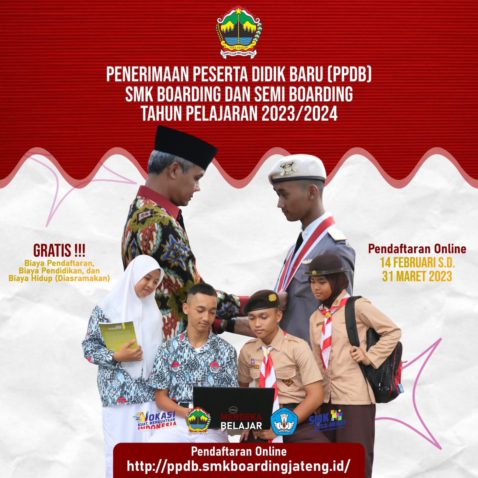 Pendaftaran Sistem Penerimaan Murid Baru (SPMB) untuk Sekolah Menengah Kejuruan Negeri (SMKN) Boarding dan Semi Boarding di Provinsi Jawa Tengah telah resmi dibuka. Proses pendaftaran ini berlangsung dari tanggal 13 Maret hingga 3 April 2026. Seleksi tahap pertama akan dilaksanakan secara daring melalui tautan yang tersedia.