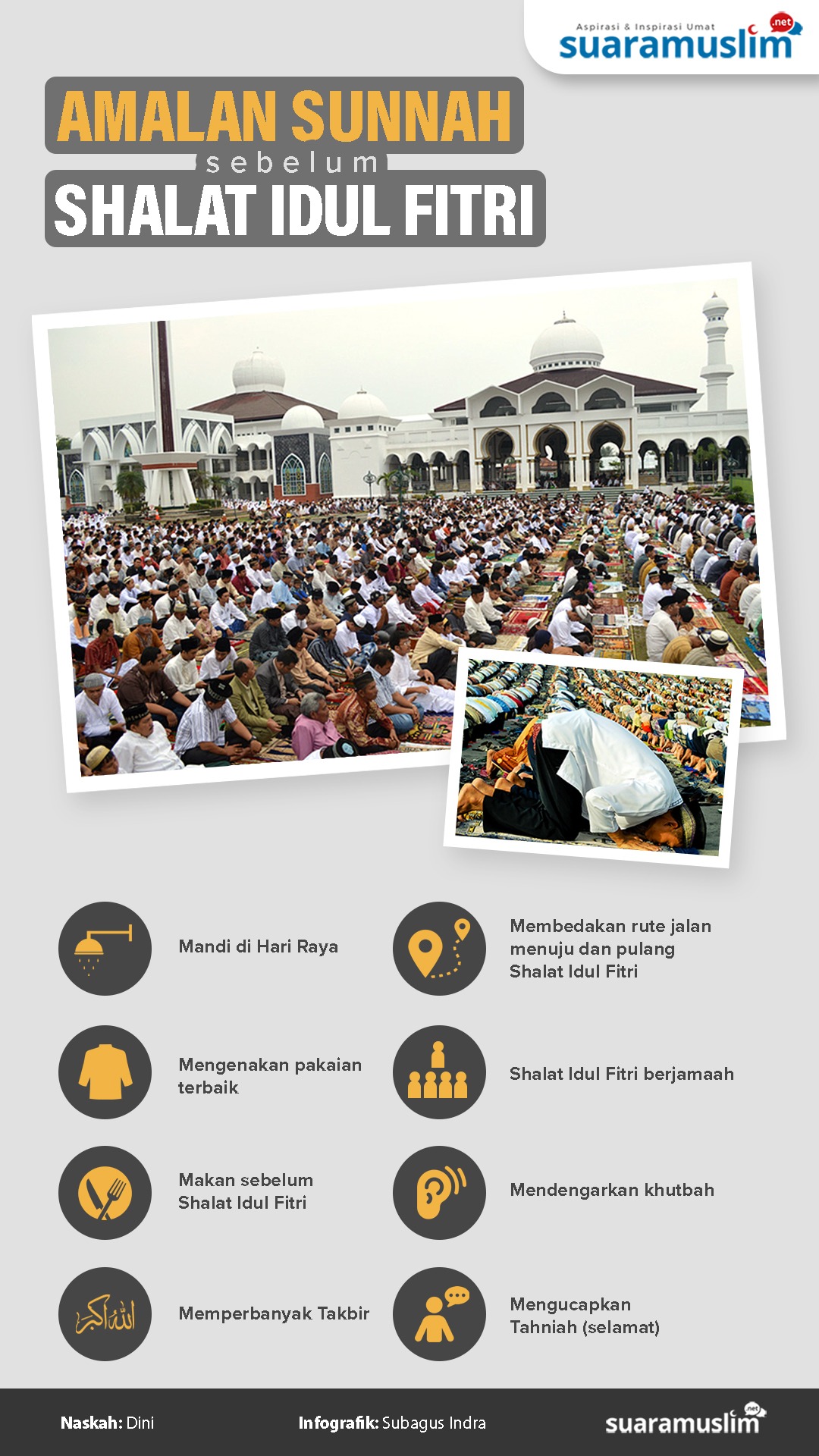 - Pada pagi hari tanggal 1 Syawal, setelah menunaikan shalat shubuh dan mandi sunnah Hari Raya, segera berangkat ke masjid atau tanah lapang sambil memperbanyak mengucapkan Takbir.