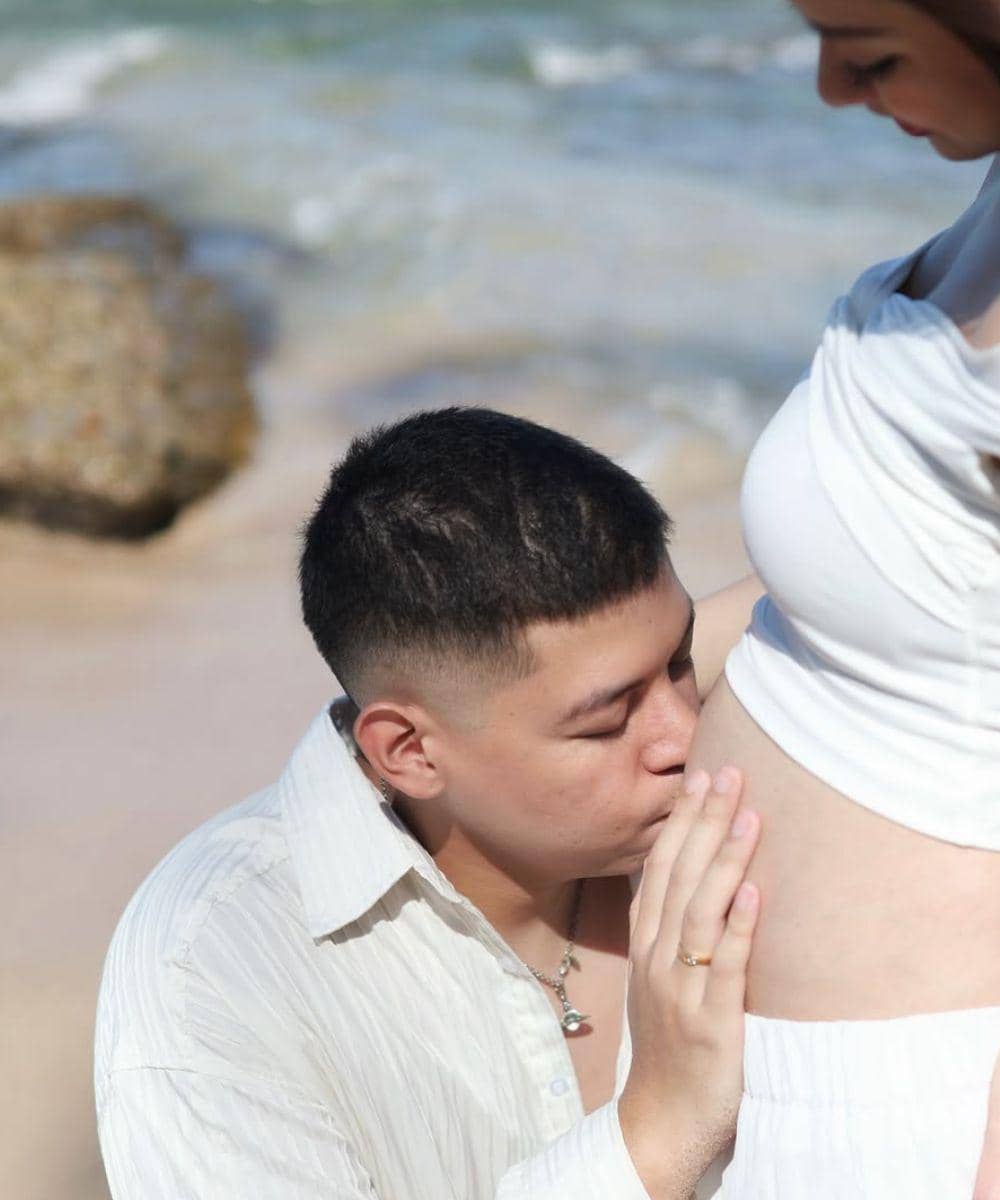 Dalam foto lainnya, Verryal tampak berlutut dan mendaratkan kecupan lembut di perut Nabila, sembari mengusapnya perlahan dengan penuh kasih. Dengan mata terpejam, ia seolah sedang berkomunikasi sekaligus menyalurkan rasa sayang kepada calon anaknya. Sementara itu, Nabila berdiri tegak sambil memegang pinggangnya, tampak merunduk memperhatikan aksi manis sang suami.